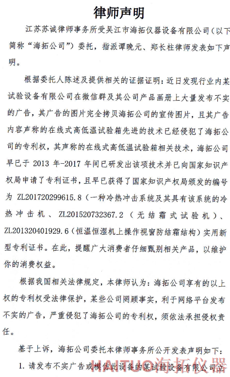 海拓儀器律師聲明:反對(duì)侵權(quán)行為 維護(hù)公司和消費(fèi)者權(quán)益摘要:國(guó)內(nèi)試驗(yàn)設(shè)備領(lǐng)先者吳江市海拓儀器設(shè)備有限公司委托律師事務(wù)所發(fā)布了律師聲明,該聲明指出,當(dāng)前市面上出現(xiàn)了產(chǎn)品專利侵犯海拓儀器權(quán)益,海拓儀器將以法律手段維護(hù)自身利益。該律師聲明要求某試驗(yàn)設(shè)備有限公司立即停止侵權(quán)行為,扯下其在網(wǎng)絡(luò)平臺(tái)的相關(guān)廣告和宣傳畫冊(cè)并同時(shí)停止生產(chǎn)同款設(shè)備。如果該設(shè)備公司不聽(tīng)勸解,海拓儀器將向人民法院依法起訴該公司侵權(quán)行為,以維護(hù)自身合法權(quán)益和維護(hù)客戶消費(fèi)權(quán)益,并建議廣大消費(fèi)者仔細(xì)甄別相關(guān)產(chǎn)品。? ? ? ?近日,吳江市海拓儀器設(shè)備有限公司委托律師事務(wù)所發(fā)布了律師聲明,該聲明指出,當(dāng)前市面上出現(xiàn)了產(chǎn)品專利侵犯海拓儀器權(quán)益,海拓儀器將以法律手段維護(hù)自身利益。??事件源起于海拓儀器發(fā)現(xiàn)市面上有同類設(shè)備公司通過(guò)完全拷貝海拓儀器產(chǎn)品宣傳圖片,在微信群及該公司產(chǎn)品畫冊(cè)上大量發(fā)布不實(shí)廣告。??聲明指出,該廣告聲稱的在線式高低溫試驗(yàn)箱的技術(shù)侵犯了海拓儀器的專利權(quán),該產(chǎn)品專利由海拓儀器