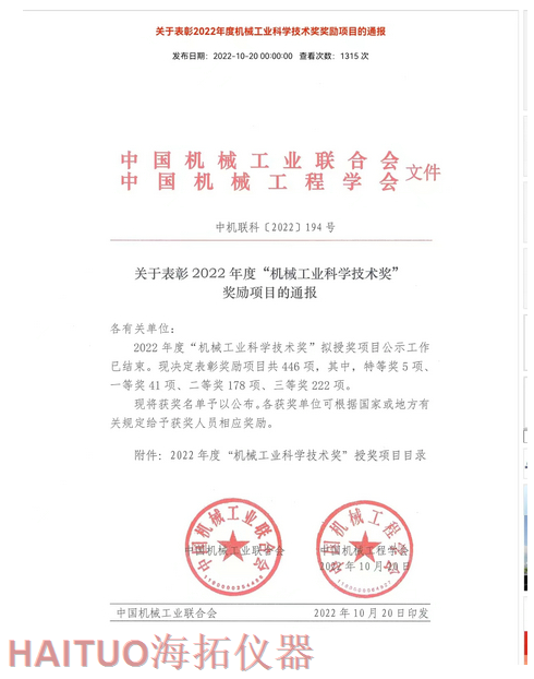 海拓儀器榮獲2022年度中國(guó)機(jī)械工業(yè)科學(xué)技術(shù)獎(jiǎng)?ICC訊?10月20日,2022年度“中國(guó)機(jī)械工業(yè)科學(xué)技術(shù)獎(jiǎng)”項(xiàng)目名錄正式發(fā)布,由海拓儀器(江蘇)有限公司完成的“超快速冷熱沖擊試驗(yàn)系統(tǒng)關(guān)鍵技術(shù)研究與系列應(yīng)用”項(xiàng)目榮獲2022年度“中國(guó)機(jī)械工業(yè)科學(xué)技術(shù)獎(jiǎng)”三等獎(jiǎng)。??據(jù)了解,中國(guó)機(jī)械工業(yè)科學(xué)技術(shù)獎(jiǎng)是根據(jù)《國(guó)家科學(xué)技術(shù)獎(jiǎng)勵(lì)條例》和《社會(huì)力量設(shè)立科學(xué)技術(shù)獎(jiǎng)管理辦法》的有關(guān)規(guī)定,由中國(guó)機(jī)械工業(yè)聯(lián)合會(huì)和中國(guó)機(jī)械工程學(xué)會(huì)共同設(shè)立并經(jīng)國(guó)家科學(xué)技術(shù)部批準(zhǔn),在國(guó)家科技獎(jiǎng)勵(lì)主管部門登記的面向全國(guó)機(jī)械行業(yè)的綜合性科技獎(jiǎng)項(xiàng)。旨在表彰在機(jī)械工業(yè)科技工作中作出突出貢獻(xiàn)的單位和人員,獎(jiǎng)勵(lì)范圍包括:機(jī)械工業(yè)科學(xué)技術(shù)發(fā)明成果、機(jī)械工業(yè)科學(xué)技術(shù)進(jìn)步成果、機(jī)械工業(yè)工程化和新技術(shù)推廣成果和機(jī)械工業(yè)軟科學(xué)和標(biāo)準(zhǔn)成果。??海拓儀器是一家集研發(fā)、制造、貿(mào)易于一體高科技現(xiàn)代化公司,公司成立于2005年,主要產(chǎn)品包括:超快速冷熱沖擊試驗(yàn)機(jī)(熱流儀)、快速溫變應(yīng)力篩選試驗(yàn)箱(ESS),